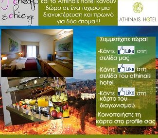 Το gocheapandchic.gr διοργανώνει διαγωνισμό και σας δίνει τη δυνατότητα να κερδίσετε μια διανυκτέρευση για δύο άτομα, μαζί με πρωινό στο ξενοδοχείο Athinais hotel.