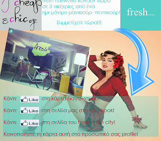 Το gocheapandchic.gr διοργανώνει διαγωνισμό και δίνει τη δυνατότητα σε 3 νικήτριες να κερδίσουν από ένα ημιμόνιμο μανικιούρ-πεντικιούρ στο κατάστημα του Περιστερίου Fresh.