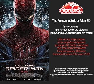 Τα Goody’s διοργανώνουν διαγωνισμό και σας δίνουν τη δυνατότητα να κερδίσετε 80 διπλές προσκλήσεις για την Avant Premiere του “The Amazing Spiderman 3D” την Κυριακή 8 Ιουλίου στον Κινηματογράφο “Αθήναιον”.
