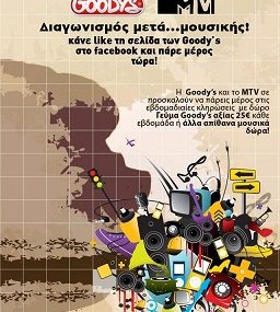 Η Goody’s και το MTV σας προσκαλούν να πάρετε μέρος στις εβδομαδιαίες κληρώσεις με δώρο γεύμα Goody’s αξίας 25 Ευρώ κάθε εβδομάδα ή άλλα απίθανα μουσικά δώρα.