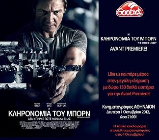 Η σελίδα Goody’s διοργανώνει διαγωνισμό και σας δίνει τη δυνατότητα να κερδίσετε 150 διπλά εισιτήρια για την Avant Premiere της ταινίας “Η ΚΛΗΡΟΝΟΜΙΑ ΤΟΥ ΜΠΟΡΝ”.