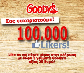 Η σελίδα Goody’s στο facebook διοργανώνει διαγωνισμό και σας δίνει τη δυνατότητα να κερδίσετε ένα γεύμα αξίας 40 ευρώ.