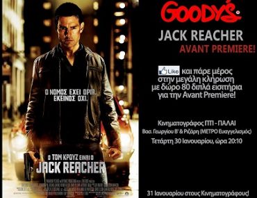 Τα Goody’s διοργανώνουν διαγωνισμό και σας δίνουν τη δυνατότητα να κερδίσετε 80 διπλές προσκλήσεις για την Avant Premiere της ταινίας JACK REACHER που θα πραγματοποιηθεί στον Κινηματογράφο «ΠΤΙ-ΠΑΛΑΙ» την Τετάρτη 30 Ιανουαρίου 2013 στις 8:10 το βράδυ.