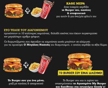 Η Goody’s διοργανώνει το διαγωνισμό «My Burger My Campaign» και σας δίνει τη δυνατότητα να κερδίσετε 2 γεύματα My Burger κάθε μέρα.