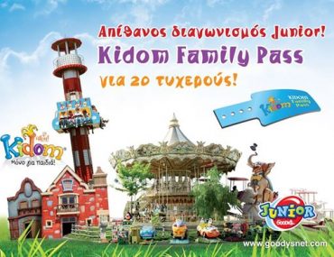Τα Goody’s διοργανώνουν διαγωνισμό και σας δίνουν τη δυνατότητα να κερδίσετε 20 family pass, το οποίο αφορά στην ημερήσια ελεύθερη διέλευση για 2 ανήλικα παιδιά έως και επτά (7) ετών, για το πάρκο Kidom, το οποίο και θα μπορούν να εξαργυρώσουν μέχρι τις 30 Νοεμβρίου, παραλαμβάνοντας το πάσο τους από τη reception του Allou ! Fun Park.