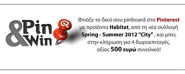 Η σελίδα Habitat Greece σας καλεί να δημιουργήσετε pinboard με όνομα “Habitat City Pin & Win”& να κάντε pin τα αγαπημένα σας προϊόντα από τη συλλογή Habitat City. Βάλτε στην περιγραφή τους το: #habitatcity. Συμπληρώσετε το link του “Habitat City Pin & Win” board σας στη σελίδα του διαγωνισμού και κερδίστε 4 δωροεπιταγές αξίας 500€ συνολικά.