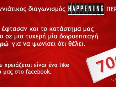 Το κατάστημα ρούχων Happening Περιστερίου σας καλεί στον Χριστουγεννιάτικο διαγωνισμό του και χαρίζει σε μία τυχερή μια δωροεπιταγή αξίας 70 ευρώ για να αγοράσει ότι επιθυμεί από το κατάστημα.