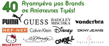 Προσφορές μέχρι 80% σε 40 αγαπημένα μας Brands. Puma, Guess, Badgley Mischka, wonderbra, Nef- Nef, Calvin Klein, Disney, DKNY Jeans, Hello Kitty, Ed Hardy, O’Neill, Paris Hilton σε απίστευτες τιμές.