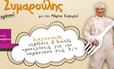 Το homefood.gr διοργανώνει διαγωνισμό και σας δίνει τη δυνατότητα να κερδίσετε 5 διπλές προσκλήσεις για την παιδική παράσταση “Ο Ζυμαρούλης” με το Μάρκο Σεφερλή στις 7/4.