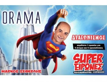 To homefood.gr διοργανώνει διαγωνισμό και σας δίνει τη δυνατότητα να κερδίσετε ένα τραπέζι για 4 άτομα με φιάλη των 120€ και 5 προσκλήσεις των 2 ατόμων για το Μουσικοθεατρικό Υπερθέαμα “SUPER ΕΙΡΩΝΕΣ”, στο ORAMA στην Θεσσαλονίκη, στις 12 Μαΐου!