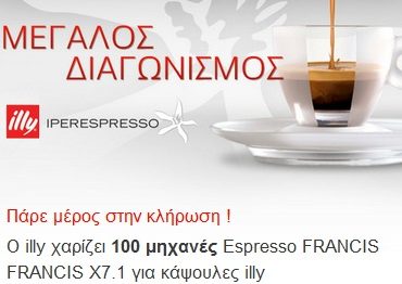 Ο καφές illy διοργανώνει διαγωνισμό και δίνει τη δυνατότητα σε 100 τυχερούς να κερδίσουν από μία μηχανή παρασκευής espresso για κάψουλες Francis Y1.1., σε όποιο χρώµα επιλέξουν οι νικητές!