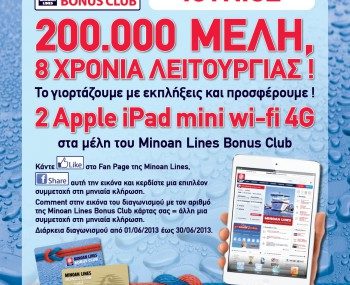 H Minoan Lines S.A. διοργανώνει διαγωνισμό για όλα τα μέλη της Bonus Club για το μήνα Μάη και δίνει τη δυνατότητα σε 2 τυχερούς να κερδίσουν από ένα ipad mini.