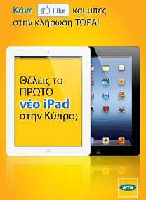 Η κυπριακή εταιρεία κινητής τηλεφωνίας MTN Cyprus προσφέρει στους φίλους της σελίδας της στο Facebook την ευκαιρία να κερδίσουν το ΠΡΩΤΟ ΝΕΟ iPad στην Κύπρο μέσω κλήρωσης.