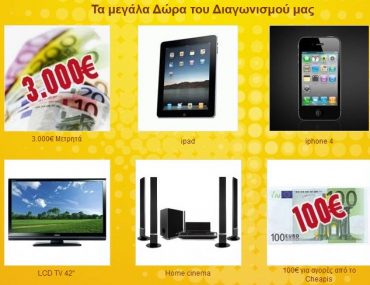 Το Cheapis.gr διοργανώνει διαγωνισμό και σας δίνει τη δυνατότητα να κερδίσετε 3000€ μετρητά, ipad, iphone4, τηλεόραση LCD 42”, Home Cinema, 100€ για αγορές από το cheapis.