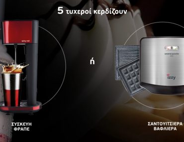 H Izzy διοργανώνει διαγωνισμό και δίνει τη δυνατότητα σε 5 τυχερούς την εβδομάδα να κερδίσουν τη συσκευή izzy που έχουν επιλέξει ανάμεσα σε Συσκευή Φραπέ ή Σαντουιτσιέρα/Βαφλιέρα!