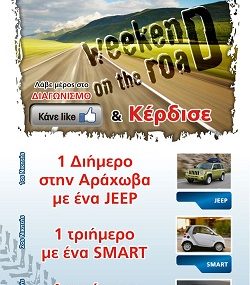 Η σελίδα Avance Greece διοργανώνει διαγωνισμό και σας δίνει τη δυνατότητα να κερδίσετε ένα τριήμερο στην Αράχωβα με ένα Jeep, ένα τριήμερο με ένα Smart και ένα τριήμερο με ένα Nissan Micra.