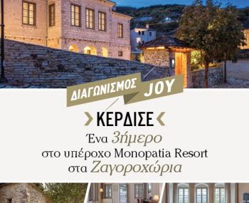 Το Joy σου δίνει την ευκαιρία να απολαύσεις ένα υπέροχο 3ήμερο, κερδίζοντας διαμονή (2 διανυκτερεύσεις, κατόπιν διαθεσιμότητας) 2 ατόμων με πρωινό, στο πολυτελές boutique ξενοδοχείο Mονοπάτια Mountain Resort (μέλος της Trésor Hotels & Resorts) στα Ζαγοροχώρια.