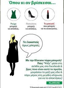 Η αλήθεια είναι πως όπου κι’ αν βρίσκεσαι… Ρούχα μπορείς να αλλάξεις. Παπούτσια μπορείς να αλλάξεις. Το μακιγιάζ σου μπορείς να το ανανεώσεις. Να λουστείς όμως μπορείς; Με την Klorane τώρα μπορείς! Πώς; “Ψάξε” μέσα στη σελίδα μας στο Facebook & βρες ποιο είναι αυτό το προϊόν, μοιράσου το μαζί μας στο Tab στα αριστερά «Όπου κι αν βρίσκεσαι…» & πάρε μέρος στη μεγάλη κλήρωση που θα γίνει 1η Ιανουαρίου για να το αποκτήσεις! Νέος Super Styling διαγωνισμός!