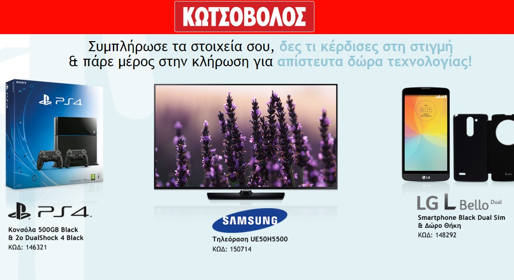 Ο Kotsovolos διοργανώνει διαγωνισμό και σας δίνει τη δυνατότητα να κερδίσετε κονσόλα SONY PS4 500GB + ΧΕΙΡΙΣΤΗΡΙΟ, τηλεόραση LED 50 ιντσών SAMSUNG UE50H5500 και smartphone LG L Bello Black Dual Sim & Δώρο Θήκη!