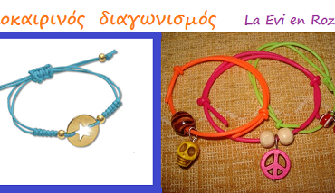 Η σελίδα La Evi en Roz διοργανώνει διαγωνισμό και δίνει τη δυνατότητα σε μια τυχερή να κερδίσει ένα τυρκουάζ βραχιόλι Happy Colour με επίχρυσο charm αστέρι σε κερωμένο κορδόνι και σε μια ακόμα να κερδίσει 3 βραχιολάκια από φωσφοριζέ καουτσούκ με στολίδια από πέτρα χαολίτη.