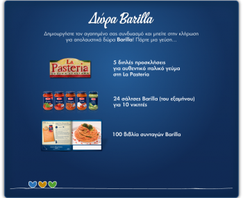 Η σελίδα της Barilla Greece διοργανώνει τον καθημερινό διαγωνισμό «Δημιουργήστε κάθε μέρα μια ιστορία αγάπης με σάλτσες και ζυμαρικά Barilla» και σας δίνει τη δυνατότητα να κερδίσετε ζυμαρικά και σάλτσες Barilla, προσκλήσεις για αυθεντικά γεύματα στη La Pasteria και στο τέλος του διαγωνισμού 2 τυχεροί θα κερδίσουν 1 iPhone 5 και 1 iPad.