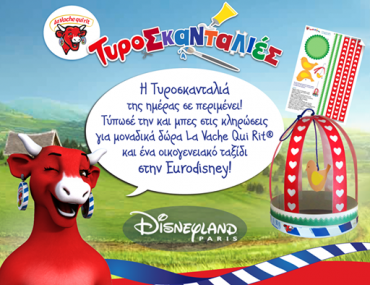 Η σελίδα La Vache Qui Rit Greece διοργανώνει διαγωνισμό και σας δίνει τη δυνατότητα να κερδίσετε 20 συνολικά δώρα: 5 τοστιέρες, 3 κούπες, 3 μπουκάλια, 3 ποδιές, 3 γάντια κουζίνας, 3 θήκες μπισκότων και στην τελική κλήρωση ένα ταξίδι στην Eurodisney της Γαλλίας για 4 άτομα και δύο διανυκτερεύσεις με μέγιστο κόστος 2.900 €.