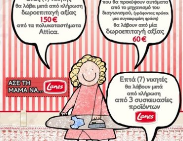 Η σελίδα Lanes διοργανώνει διαγωνισμό και σας δίνει τη δυνατότητα να κερδίσετε 1 δωροεπιταγή αξίας 150 ευρώ από τα Attica, 2 δωροεπιταγές αξίας 60 ευρώ από τα Attica και 3 συσκευασίες προϊόντων Lanes σε ακόμα 7 τυχερούς.