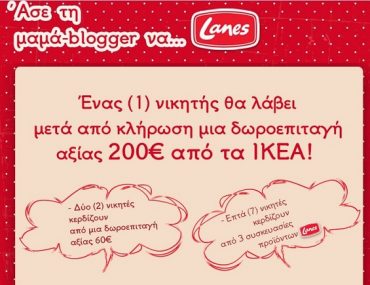 Η σελίδα Lanes Health διοργανώνει διαγωνισμό και δίνει τη δυνατότητα σε 1 τυχερό να κερδίσει μια δωροεπιταγή 200 ευρώ για αγορές από τα καταστήματα ΙΚΕΑ, σε 2 τυχερούς να κερδίσουν από μία δωροεπιταγή αξίας 60 ευρώ από τα πολυκαταστήματα Attica και σε 7 ακόμα, από 3 συσκευασίες προϊόντων Lanes.