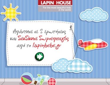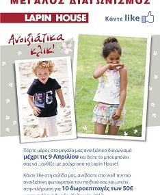 Tα Lapin House διοργανώνουν διαγωνισμό στο facebook και δίνουν την ευκαιρία σε 20 νικητές να κερδίσουν από μία δωροεπιταγή αξίας 50€ οι οποίες μπορούν να εξαργυρωθούν αποκλειστικά και μόνο στα καταστήματα Lapin House