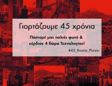 Το ΠΛΑΙΣΙΟ κλείνει 45 χρόνια & το γιορτάζει με φωτογραφικό διαγωνισμό! Πόσταρε στον τοίχο του παλιές φωτογραφίες που σας θυμίζουν Πλαίσιο ή gadgets «αρχαιολογίες», κινητά «παντόφλες», «προϊστορικά» είδη γραφείου με hashtag και κερδίστε 1 Τurbo-X Laptop Turbo-X Flynote GT u5-450, 1 Turbo-X TV 55” TXV-5523SMT, 1 Turbo-X Smartphone Ω και 1 δωροεπιταγή αξίας 100€ για αγορές από τα καταστήματα Πλαίσιο.