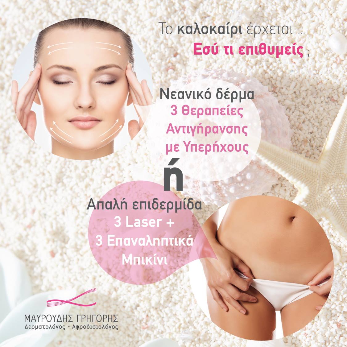 Το Δερματολογικό Ιατρείο Μαυρουδής Γρηγόρης στη Θεσσαλονίκη διοργανώνει διαγωνισμό και δίνει τη δυνατότητα σε 2 τυχερές να κερδίσουν από 3 θεραπείες αντιγήρανσης με υπερήχους ή 3 συνεδρίες Laser αποτρίχωσης για το μπικίνι!