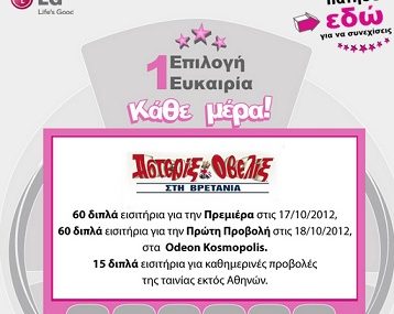 Η LG Hellas διοργανώνει διαγωνισμό και σας δίνει τη δυνατότητα να κερδίσετε κάθε μέρα, διπλά εισιτήρια για την Πρεμιέρα της ταινίας «Αστερίξ και Οβελίξ στη Βρετανία», η οποία θα πραγματοποιηθεί την Τετάρτη 17 Οκτωβρίου του 2012, στον κινηματογράφο ODEON KOSMOPOLIS, αίθουσα 5 ή διπλά εισιτήριο για την Πρώτη επίσημη προβολή της ταινίας, η οποία θα πραγματοποιηθεί την Πέμπτη 18 Οκτωβρίου του 2012, στον κινηματογράφο ODEON KOSMOPOLIS. Οι νικητές που κατοικούν εκτός Αθηνών κερδίζουν διπλά εισιτήρια τα οποία και θα μπορέσουν να εξαργυρώσουν σε όλους τους κινηματογράφους της Odeon από την έναρξη της ταινίας στον κινηματογράφο της περιοχής τους.