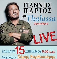 Η σελίδα του Ελευθερουδάκης – Etiquette Ηράκλειο διοργανώνει διαγωνισμό και σας δίνει τη δυνατότητα να κερδίσετε 5 εισιτήρια για το Live του Γιάννη Πάριου στο Thalassa στην Αμμουδάρα Ηρακλείου Κρήτης το Σάββατο 15 Σεπτεμβρίου (μαζί με τον Χάρη Βαρθακούρη).