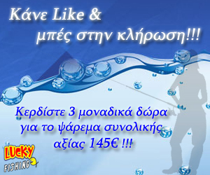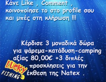 Η σελίδα Lucky-Fishing διοργανώνει διαγωνισμό και δίνει τη δυνατότητα στον πρώτο τυχερό να κερδίσει ένα μηχανάκι Shimatsu Atlas 5000, στο δεύτερο τυχερό μια μάσκα και ένα αναπνευστήρα Glaros sub, στον τρίτο έναν υπνόσακο Τerra Sleeping bag και σε 3 ακόμα τυχερούς από 2 προσκλήσεις για την έκθεση της Natex, για δωρεάν είσοδο.