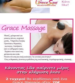 Το Grace Spa Marousi διοργανώνει διαγωνισμό στο Facebook και και δίνει τη δυνατότητα σε 2 τυχερούς να κερδίσουν από ένα Gracespa Massage αξίας 70€.