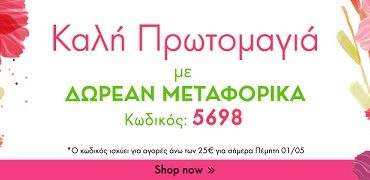 Το MelinaMay.com σας εύχεται Καλή Πρωτομαγιά με δωρεάν μεταφορικά! Για αγορές άνω των 25€ και μόνο για σήμερα, με τον κωδικό 5698, έχετε δωρεάν τα μεταφορικά!