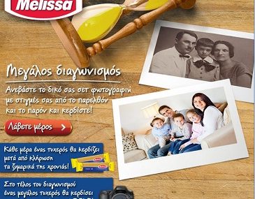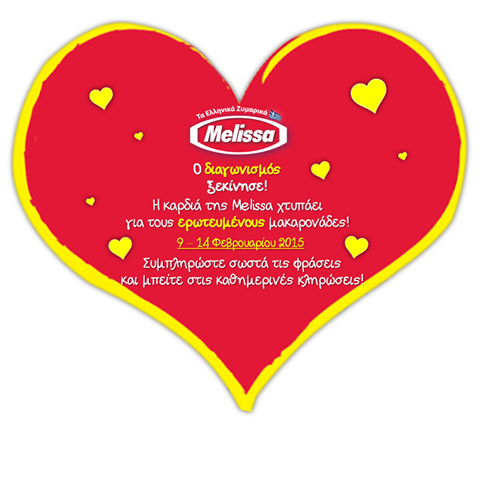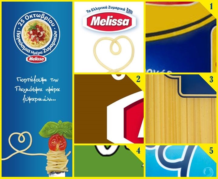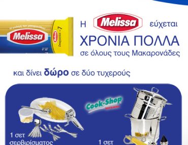 Η Melissa διοργανώνει διαγωνισμό και δίνει τη δυνατότητα σε 1 τυχερό κάθε μέρα να κερδίσει «τα ζυμαρικά της χρονιάς» δηλαδή ένα πακέτο με ζυμαρικά βάρους 10 κιλών. Επίσης στο τέλος του διαγωνισμού 1 τυχερός θα κερδίσει 1 ψηφιακή φωτογραφική μηχανή DSLR.