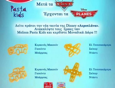 Η σελίδα Melissa διοργανώνει διαγωνισμό και δίνει τη δυνατότητα σε 50 τυχερούς να κερδίσουν από μία διπλή πρόσκληση για την avant première της νέας ταινίας της Disney «Αεροπλάνα», (η προβολή της avant première θα γίνει την 20η Αυγούστου 2013 και ώρα 7:00 μμ στα Village Cinemas in The Mall Athens, στο Μαρούσι Αττικής, με ώρα προσέλευσης 6:15 μμ) και από ένα κιβώτιο Ζυμαρικά Melissa Pasta Kids Planes (που περιέχει 6 κιλά συσκευασμένου προϊόντος). Επίσης θα αναδειχθούν 50 ακόμα τυχεροί, οι οποίοι θα κερδίσουν από μια αφίσα της νέας ταινίας της Disney «Αεροπλάνα» και από ένα κιβώτιο Ζυμαρικά Melissa Pasta Kids Planes.
