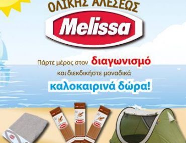 Η Melissa διοργανώνει το διαγωνισμό “Απολαμβάνω το Ελληνικό καλοκαίρι με τα Melissa Ολικής Αλέσεως” που θα αναδείξει συνολικά 192 τυχερούς! Θα γίνουν 6 κληρώσεις και η κάθε μια θα έχει 32 τυχερούς νικητές! Σε κάθε κλήρωση, 6 τυχεροί θα κερδίσουν τα σπαγγέτι Melissa Ολικής Αλέσεως μιας χρονιάς (αντιστοιχούν σε 10 κιλά προϊόντος ή αλλιώς σε 20 συσκευασίες των 500γρ), ακόμα 6 τυχεροί θα κερδίσουν από μία σκηνή camping TERRA και 20 τυχεροί από μια πετσέτα θαλάσσης ΑΝΕΜΟΣ.