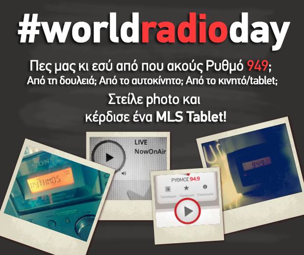 Εσύ από που ακούς Ρυθμό 949; Από τη δουλειά; Από το αυτοκίνητο; Από το κινητό; Aπο όπου και να μας ακούς το μόνο που έχεις να κάνεις είναι να βγάλεις μια φωτογραφία τη συχνότητα του Ρυθμού 949 και να την ανεβάσεις. Αυτόματα μπαίνεις στην κλήρωση και μπορεί να είσαι εσύ ο τυχερός που θα κερδίσει ένα MLS tablet!