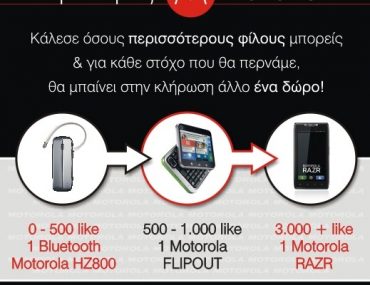 Η Motorola Hellas διοργανώνει διαγωνισμό στο Facebook για ένα bluetooth Motorola HZ800, ένα Motorola Flipout και ένα Motorola Razr.