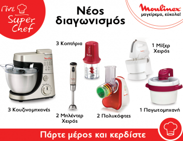Η σελίδα Moulinex Greece διοργανώνει διαγωνισμό και σας δίνει τη δυνατότητα (στο τέλος του διαγωνισμού) να κερδίσετε 3 κουζινομηχανές Moulinex: μια Masterchef Gourmet, μια Masterchef Gourmet red ruby collection και μια Minichef Gourmet. Επιπλέον κάθε εβδομάδα θα κληρώνεται ένα δώρο Moulinex.