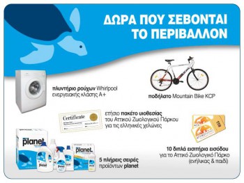 Το my planet διοργανώνει διαγωνισμό και σας δίνει τη δυνατότητα να κερδίσετε 1 πλυντήριο ενεργειακής κλάσης Α+, 1 ποδήλατο, 10 εισιτήρια για το Αττικό Ζωολογικό Πάρκο, 1 Πακέτο Υιοθεσίας για τις Ελληνικές Χελώνες και 5 σειρές προϊόντων planet.