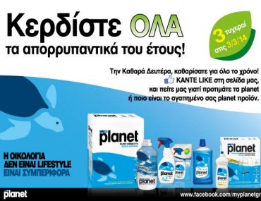 Το My Planet διοργανώνει διαγωνισμό και δίνει τη δυνατότητα σε 3 τυχερούς να κερδίσουν απορρυπαντικά για ένα χρόνο, ένα ποδήλατο και άλλα δωράκια my planet (μπλουζάκια, τσάντες, USB).
