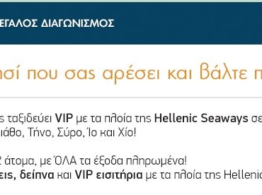 Το mygreece.travel σας ταξιδεύει VIP με τα πλοία της Hellenic Seaways σε Σαντορίνη, Νάξο, Μύκονο, Ύδρα, Σκιάθο, Τήνο, Σύρο Ίο και Χίο. Κερδίστε ένα ταξίδι για 2 άτομα με ΟΛΑ τα έξοδα πληρωμένα! Με 3 διανυκτερεύεσεις, δείπνα και VIP εισιτήρια με τα πλοία της Hellenic Seaways. διοργανώνει διαγωνισμό και σας δίνει τη δυνατότητα να κερδίσετε ένα σετ παιδικές πετσέτες, με δύο τεμάχια, μία μπάνιου και μία προσώπου.