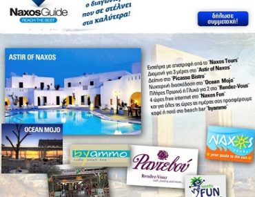 Το Naxos Guide διοργανώνει διαγωνισμό και σας δίνει τη δυνατότητα να κερδίσετε ένα 3ήμερο ταξίδι για 2 άτομα στην Νάξο με πληρωμένα ακτοπλοϊκά εισιτήρια, διαμονή, 1 γεύμα για 2 άτομα,1 ποτό για 2 άτομα, 1 πρωινό ή γλυκό για 2 άτομα, καφές ή ποτό για 2 άτομα σεbeach bar, 4 ώρες internet σε internet café.