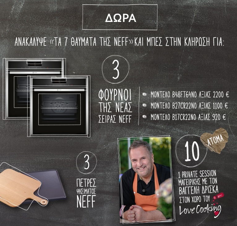 Το love cooking by Neff διοργανώνει διαγωνισμό και δίνει τη δυνατότητα σε 16 συνολικά τυχερούς να κερδίσουν φουρνους Neff, πέτρες ψησίματος και μαθήματα μαγειρικής