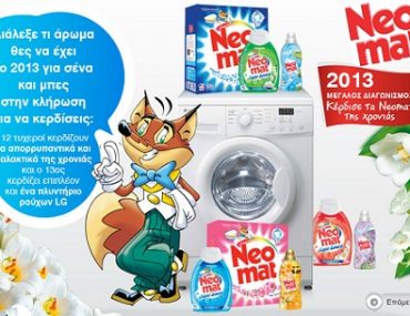 Η σελίδα Neomat διοργανώνει διαγωνισμό και δίνει τη δυνατότητα σε 12 τυχερούς να κερδίσουν τα απορρυπαντικά και μαλακτικά της χρονιάς και στο 13ο να κερδίσει επιπλέον ένα πλυντήριο ρούχων LG.