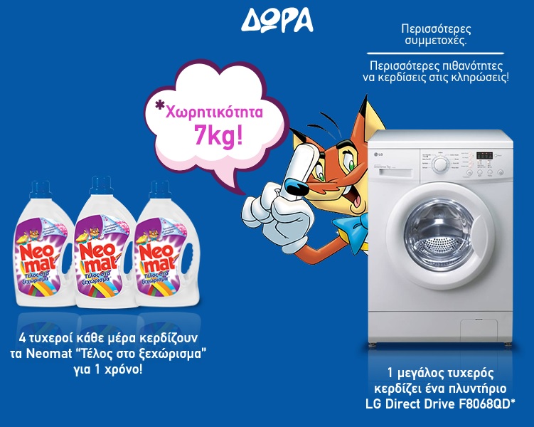 H Henkel Hellas διοργανώνει διαγωνισμό και δίνει τη δυνατότητα σε 200 τυχερούς να κερδίσουν συσκευασίες Neomat και σε ένα μεγάλο τυχερό ένα πλυντήριο LG F8068QD!