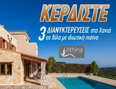 To newsbeast.gr διοργανώνει διαγωνισμό και σας δίνει τη δυνατότητα να κερδίσετε ένα 4ήμερο (3 διανυκτερεύσεις) στο πολυτελές συγκρότημα «Athina Luxury Villas» με ιδιωτική πισίνα στα Χανιά Κρήτης!